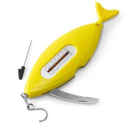 5-in-1 fishing tool includes Tape Measure, Bait Inserter, Weight Scale, Serrated Knife and Fish Scraper. Designed to handle multi-work in a hurry while fishing, no need to dig out