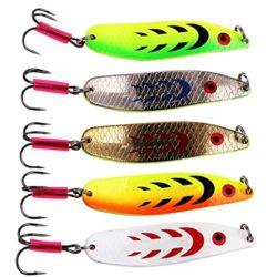 Assorted different colors of metal spoons pack of 5pcs.Single length is approx 4in including hook, weight is approx 0.7oz Product Features Assorted metal spoons for freshwater or saltwater fishing.