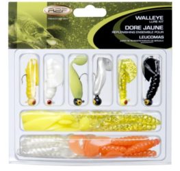 The Ready 2 Fish Walleye 3 Kit includes 44 prerigged grubs with 4 different color options, 2 prerigged paddle tail minnows in two different color options. This kit also