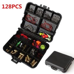 Features: 20+ kinds of fishing tackle 128 pieces. Complete category, contains crank hook,bullet copper, lead head hook,treble hook etc. The fishing tackle box set comes with all the accessories