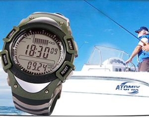 50m water resistant Fish Finder Watch. Army-Green Color. Fishing time remind function.pressure tracking function for 6 fishing places. MAKES FISHING EASY AND FUN!! GREAT AS A GIFT!! We try